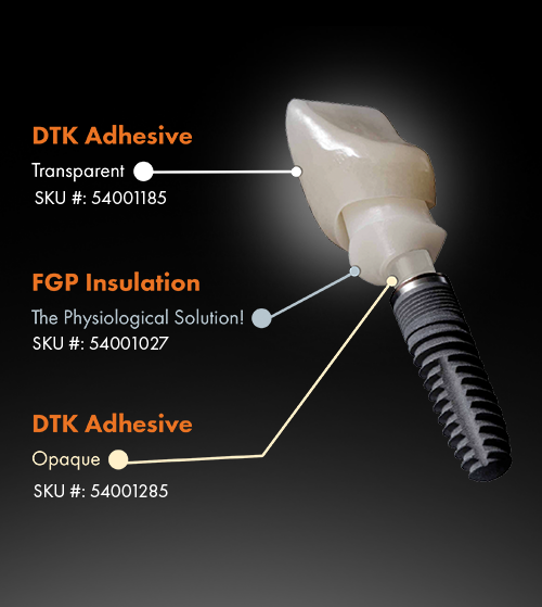 The dual-curing DTK adhesive facilitates a durable and secure bond between all prosthetic materials. Ideal for bonded, individual abutments – Can now be sterilised.